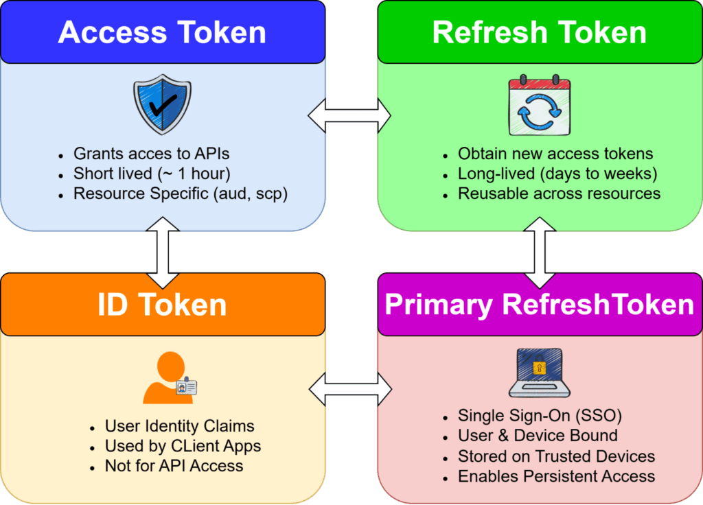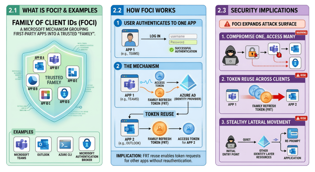 Access Tokens provide scoped access (aud, scp), Refresh Tokens extend session continuity, and PRTs elevate trust by binding identity to a device using cryptographic mechanisms like proof-of-possession. With FOCI, this trust can extend across multiple Microsoft clients rather than staying limited to a single application.
